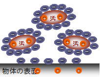 汚れと物体の表面が同じマイナスイオン同士となり、反発しあって剥離、分散します。